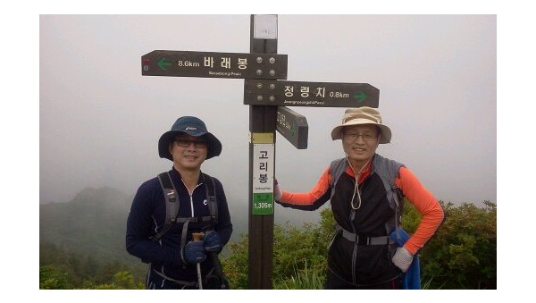 바래봉에서 김정환 목사님과 사모님.. 뒤로 희미하게 걸어 온 능선이 보이네요. 고리봉과 세걸산..