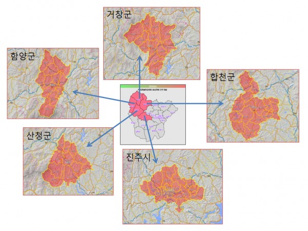행정구역경계로 본 진주지방 지도 1. 전체보기 2. 진주지방 3. 거창군 4. 함양군 5. 산청군 6. 합천군 7. 진주시