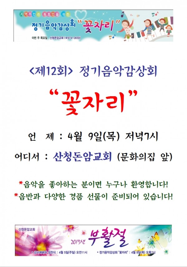 열 다섯 번째 "꽃자리"가 이번 주 목요일(9일) 저녁 7시부터 열립니다. 이 달엔 두 번째로 클래식 성악곡과 대중음악 보컬 특집으로 진행됩니다. 특별히 지방 동역자 한 분의 독창도 들으실 수 있고요...^^ 이제 본격적인 여름이 시작된다는 '소서'가 내일 모레(7일)인데, 무더위를 식혀줄 멋진 음악과 좋은 분들과의 만남에 지방 동역자들도 초대합니다. 음악을 좋아하는 분이면 누구든지 환영합니다~! 산청돈암교회의 문화활동이 지역 문화증진과 선교에 도움이 될 수 있도록 기도해 주십시오.