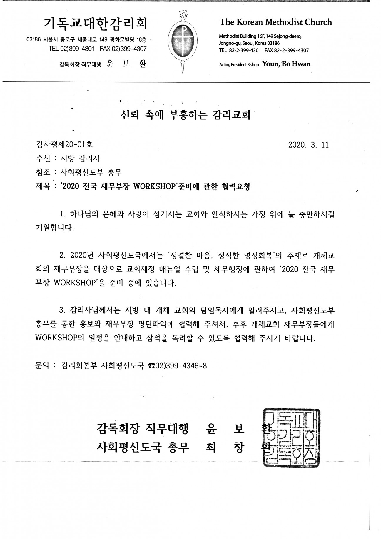 2020 전국 재무부장 workshop 준비에 관한 협력요청 안내 본문 2020 전국 재무부장 workshop 준비에 관한 협력요청 안내 사회평신도국 주최 교회재정 매뉴얼 수립 및 세무행정에 관하여 '2020 전국 재무부장 workshop'을 준비하면서 보낸 협조 요청 공문입니다. 참고하시기 바랍니다. 정진근 조회 4,560회 2020-03-17 15:32 목록 댓글목록 이전글 연회 별세 목회자 상조비 협조 요청 건 20.03.24 다음글 진주지방 목회자, 장로 주소록입니다. 확인바랍니다. 20.03.03