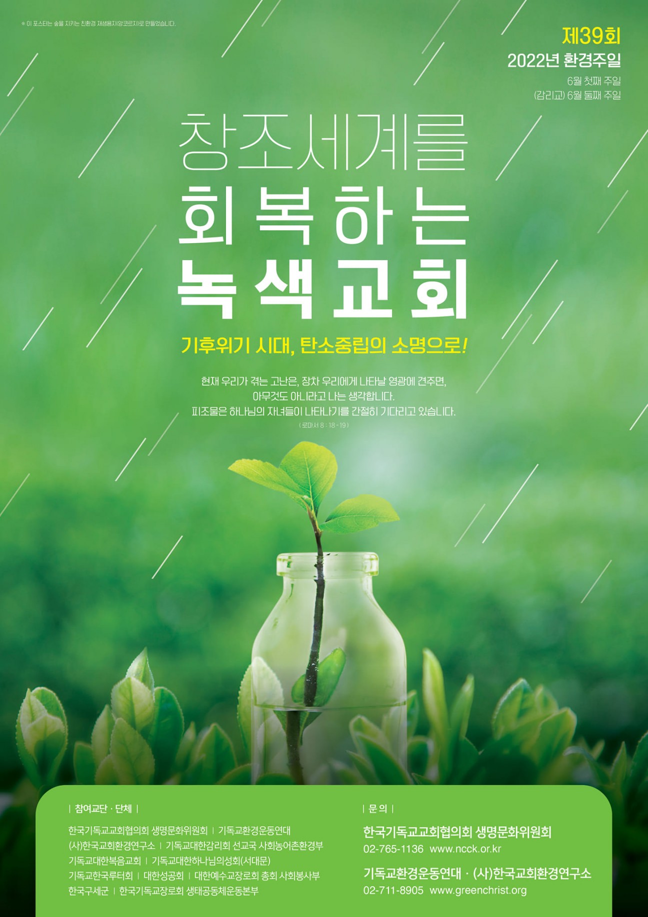환경선교주일을 지켜주세요 본문 환경선교주일을 지켜주세요 제 39회 환경주일창조세계를 회복하는 녹색교회- 기후위기 시대, 탄소중립의 소명으로환경주일은 기환연의 전신인 한국공해문제연구소에서 1983년에 6월 5일 환경의 날을 맞아 6월 첫째 주일을 환경주일로 선포하고 예배를 드린 것에서 시작되었습니다.현재는 많은 개신교 교단에서 6월 첫째 주일 혹은 둘째 주일을 창조세계의 온전함을 기도하는 환경주일, 환경선교주일로 성수하고 있습니다. 우리 감리교회는 6월 둘째주일을 환경선교주일로 지키고 있습니다. 첨부한 자료집을 참고해서 환경선교주일(6월12일)을 성수해 주시기를 바랍니다. 노재화 조회 1,708회 2022-06-03 20:36 목록 댓글목록 이전글 농촌선교주일을 지켜주세요~ 22.08.30 다음글 창조의 신비를 걷다 잘 다녀왔습니다~ 22.06.03