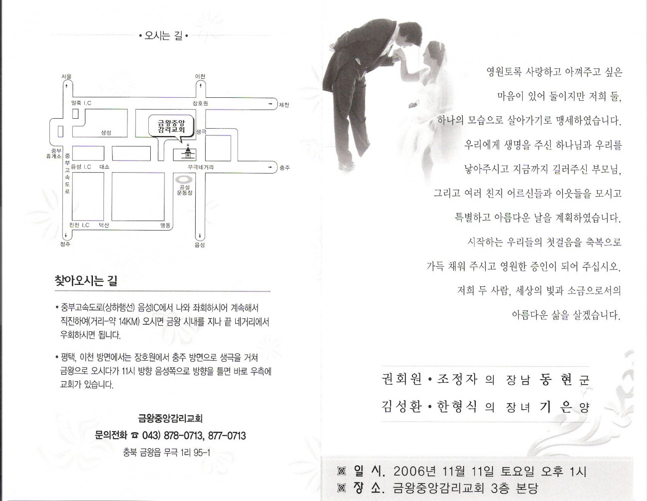 저희 여식 기은이가 결혼합니다!! 축하해 주세요!! 본문 저희 여식 기은이가 결혼합니다!! 축하해 주세요!! 오는 11월 11일(토) 오후 1시. 충북 음성군 금왕읍 소재 금왕중앙감리교회 대예배실에서 주님의 사랑과 여러분들의 축복속에 저희 여식 기은이(김성환, 한형식의 장녀)가 신랑 권동현(권회원, 조정자의 장남)군과 혼인예식을 갖고자 합니다. 별도로 청첩장은 보내드리지 못하였는데 양해해 주시고, 혼인 예식을 위하여 기도해 주시기 바랍니다. 결혼 당일 참여치 못하시는 분들을 위하여 따로 피로연을 준비하였는데, 피로연은 오는 11월 7일(화) 오전11부터 오후 4시까지 저희 교회(진주은빛교회)에서 준비하였습니다. 혼인예식을 올리는 날, 참여하여 함께 축하해 주실 분들은 당일 오전 9시에 강남교회(담임:권영화 목사)에서 출발하는 전세버스나 교회차량을 이용하시면 됩니다. 주안에서 늘 강건하시기를 기원합니다. 여호와 샬롬! 조태희 : 따님의 복된 결혼을 축하드립니다. -[10/26-19:17]- 김성환 목사 조회 4,563회 2006-10-23 23:25 수정 삭제 목록 댓글목록 이전글 대동교회 관상기도 세미나 06.11.02 다음글 진주중앙교회 바자회합니다. 06.10.20