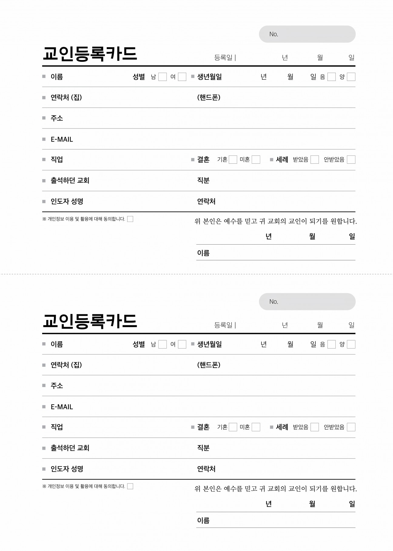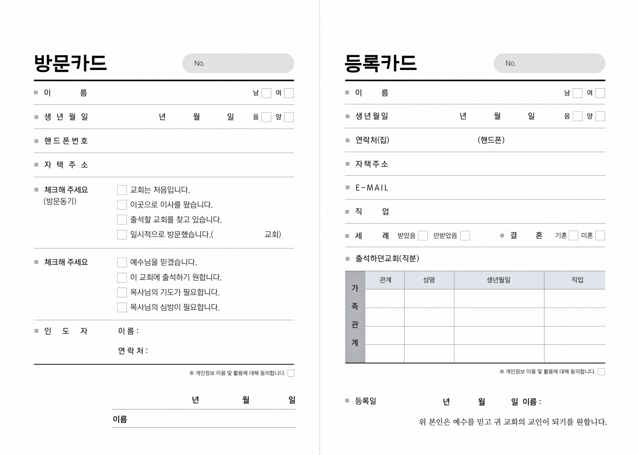 교인등록카드와 방문카드 본문 교인등록카드와 방문카드교인등록카드와 방문카드 위 파일을 내려 받으시고, 인쇄해서 사용하시면 됩니다. - 윤선디자인 제공 이신일 조회 3,470회 2018-05-02 22:22 목록 댓글목록 이전글 종교인소득신고 관련 세미나 자료(강사:김명진 목사) 18.11.19 다음글 2018년 진주지방 교회별 부담금 안내(부담금확정) 18.03.20