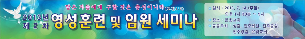 2013년 제2차 영성훈련및 임원세미나 본문 2013년 제2차 영성훈련및 임원세미나 현수막 [이 게시물은 정보통신님에 의해 2013-07-12 21:22:20 공지사항에서 이동 됨] 박종찬 조회 3,675회 2013-07-12 17:10 목록 댓글목록 이전글 미국인이 가장 많이 쓰는 문장 13.11.02 다음글 2013년 진주지방 체육대회 준비 13.06.25